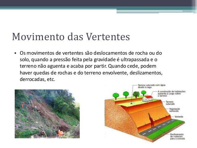 10. 10. Movimento das Vertentes• Os movimentos de vertentes são deslocamentos de rocha ou dosolo, quando a pressão feita pela gravidade é ultrapassada e oterreno não aguenta e acaba por partir. Quando cede, podemhaver quedas de rochas e do terreno envolvente, deslizamentos,derrocadas, etc.