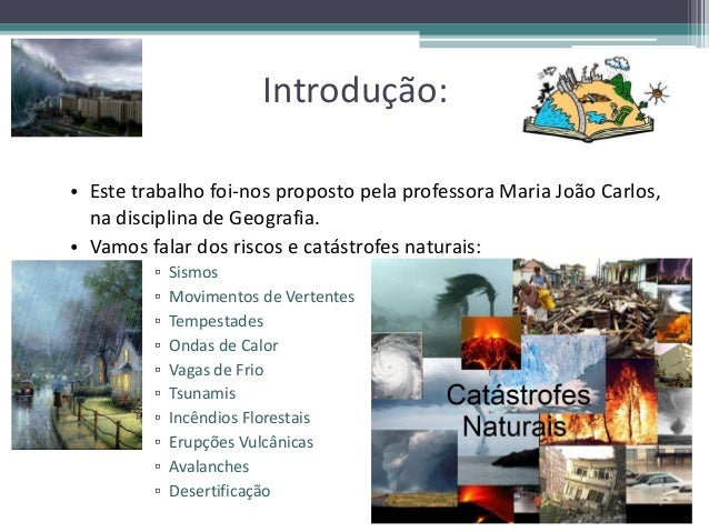 2. 2. Introdução:• Este trabalho foi-nos proposto pela professora Maria João Carlos,na disciplina de Geografia.• Vamos falar dos riscos e catástrofes naturais:▫ Sismos▫ Movimentos de Vertentes▫ Tempestades▫ Ondas de Calor▫ Vagas de Frio▫ Tsunamis▫ Incêndios Florestais▫ Erupções Vulcânicas▫ Avalanches▫ Desertificação
