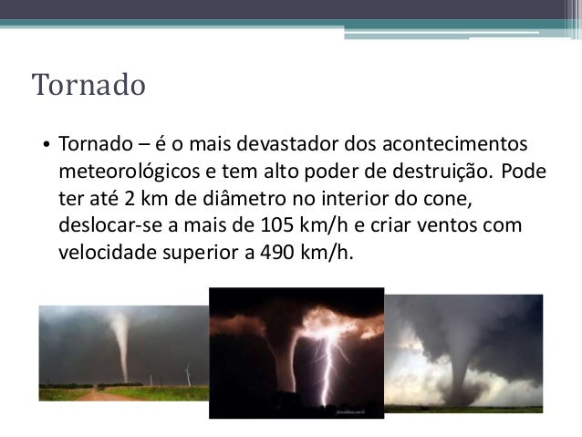 18. 18. Tornado• Tornado – é o mais devastador dos acontecimentosmeteorológicos e tem alto poder de destruição. Podeter até 2 km de diâmetro no interior do cone,deslocar-se a mais de 105 km/h e criar ventos comvelocidade superior a 490 km/h.