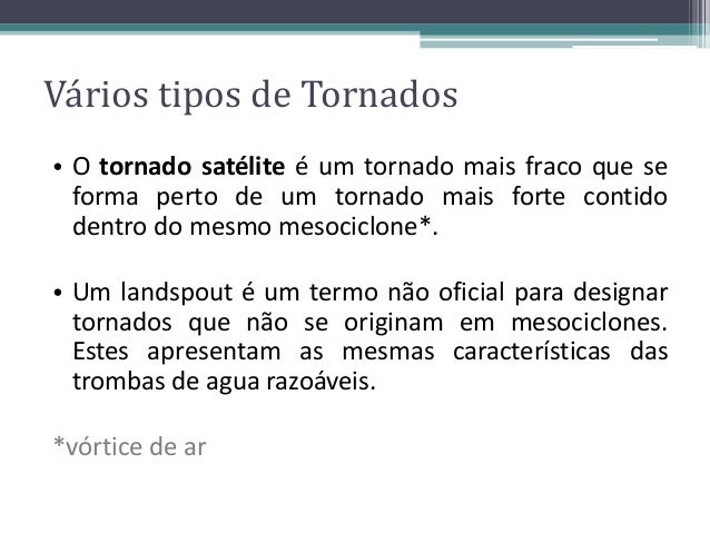 20. 20. • O tornado satélite é um tornado mais fraco que seforma perto de um tornado mais forte contidodentro do mesmo mesociclone*.• Um landspout é um termo não oficial para designartornados que não se originam em mesociclones.Estes apresentam as mesmas características dastrombas de agua razoáveis.*vórtice de arVários tipos de Tornados