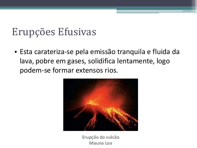 24. 24. • Esta carateriza-se pela emissão tranquila e fluida dalava, pobre em gases, solidifica lentamente, logopodem-se formar extensos rios.Erupção do vulcãoMauna LoaErupções Efusivas