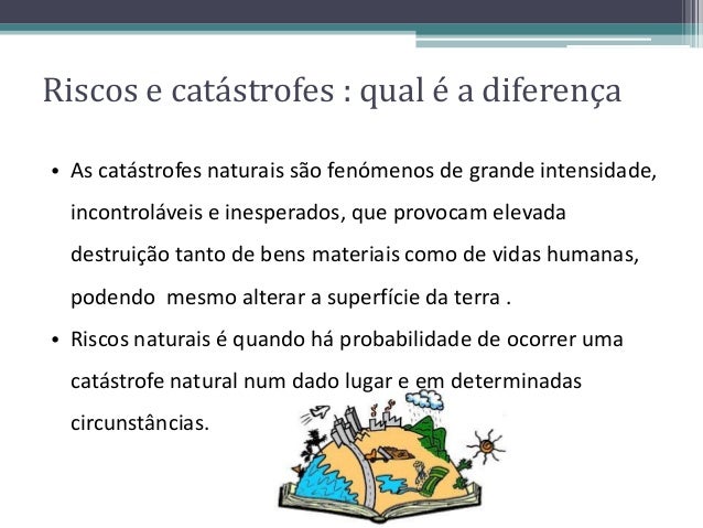 3. 3. Riscos e catástrofes : qual é a diferença• As catástrofes naturais são fenómenos de grande intensidade,incontroláveis e inesperados, que provocam elevadadestruição tanto de bens materiais como de vidas humanas,podendo mesmo alterar a superfície da terra .• Riscos naturais é quando há probabilidade de ocorrer umacatástrofe natural num dado lugar e em determinadascircunstâncias.