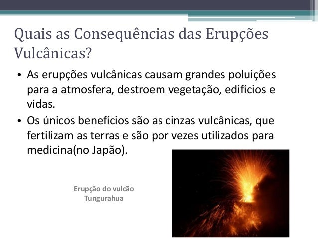 28. 28. • As erupções vulcânicas causam grandes poluiçõespara a atmosfera, destroem vegetação, edifícios evidas.• Os únicos benefícios são as cinzas vulcânicas, quefertilizam as terras e são por vezes utilizados paramedicina(no Japão).Erupção do vulcãoTungurahuaQuais as Consequências das ErupçõesVulcânicas?