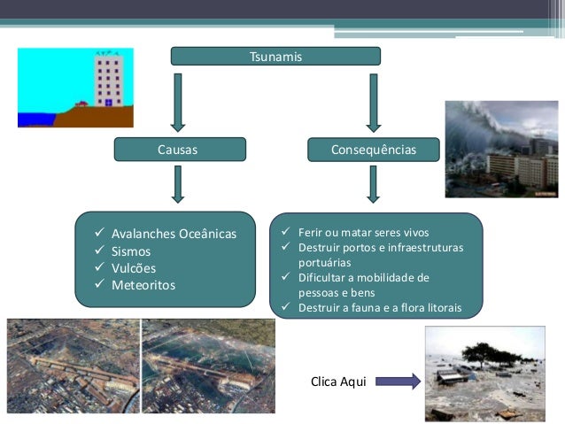 33. 33. Tsunamis Avalanches Oceânicas Sismos Vulcões MeteoritosCausas Consequências Ferir ou matar seres vivos Destruir portos e infraestruturasportuárias Dificultar a mobilidade depessoas e bens Destruir a fauna e a flora litoraisClica Aqui
