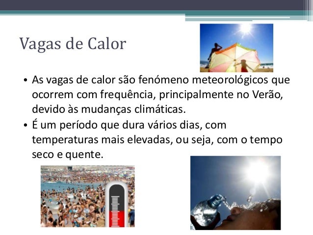 34. 34. Vagas de Calor• As vagas de calor são fenómeno meteorológicos queocorrem com frequência, principalmente no Verão,devido às mudanças climáticas.• É um período que dura vários dias, comtemperaturas mais elevadas, ou seja, com o temposeco e quente.