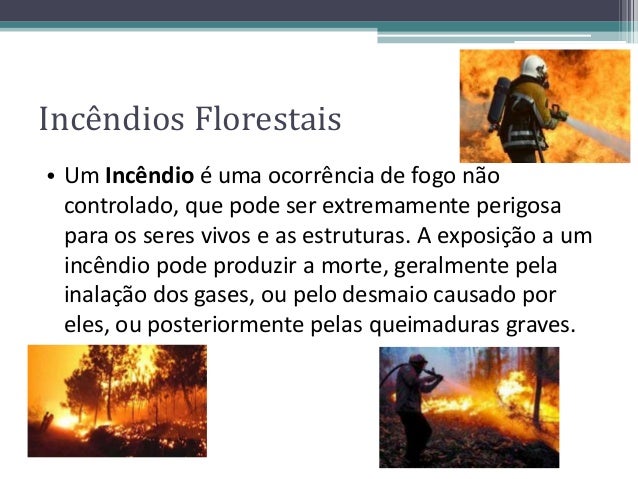 37. 37. Incêndios Florestais• Um Incêndio é uma ocorrência de fogo nãocontrolado, que pode ser extremamente perigosapara os seres vivos e as estruturas. A exposição a umincêndio pode produzir a morte, geralmente pelainalação dos gases, ou pelo desmaio causado poreles, ou posteriormente pelas queimaduras graves.
