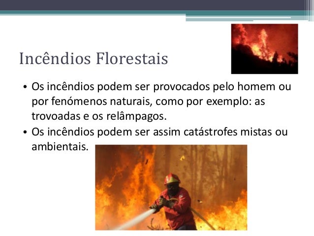 38. 38. Incêndios Florestais• Os incêndios podem ser provocados pelo homem oupor fenómenos naturais, como por exemplo: astrovoadas e os relâmpagos.• Os incêndios podem ser assim catástrofes mistas ouambientais.