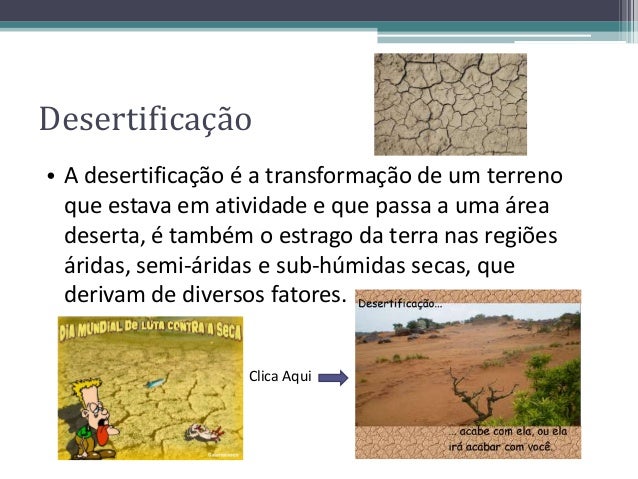 40. 40. Desertificação• A desertificação é a transformação de um terrenoque estava em atividade e que passa a uma áreadeserta, é também o estrago da terra nas regiõesáridas, semi-áridas e sub-húmidas secas, quederivam de diversos fatores.Clica Aqui