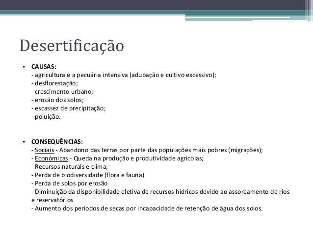 41. 41. Desertificação• CAUSAS:- agricultura e a pecuária intensiva (adubação e cultivo excessivo);- desflorestação;- crescimento urbano;- erosão dos solos;- escassez de precipitação;- poluição.• CONSEQUÊNCIAS:- Sociais - Abandono das terras por parte das populações mais pobres (migrações);- Económicas - Queda na produção e produtividade agrícolas;- Recursos naturais e clima;- Perda de biodiversidade (flora e fauna)- Perda de solos por erosão- Diminuição da disponibilidade eletiva de recursos hídricos devido ao assoreamento de riose reservatórios- Aumento dos períodos de secas por incapacidade de retenção de água dos solos.