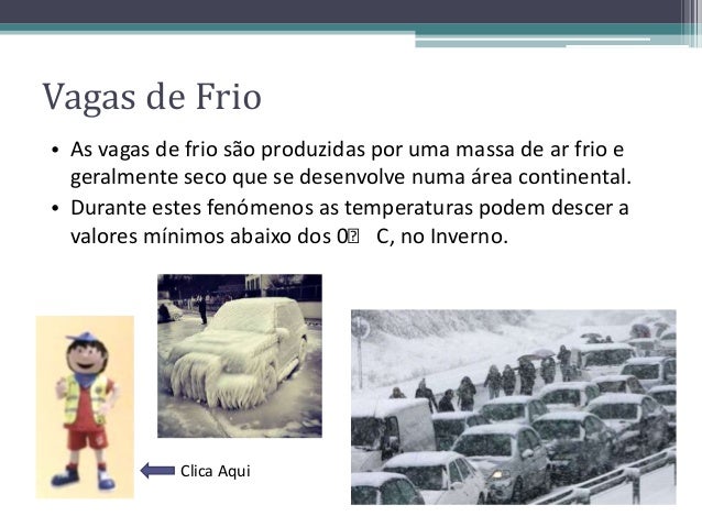 43. 43. Vagas de Frio• As vagas de frio são produzidas por uma massa de ar frio egeralmente seco que se desenvolve numa área continental.• Durante estes fenómenos as temperaturas podem descer avalores mínimos abaixo dos 0ᵒ C, no Inverno.Clica Aqui