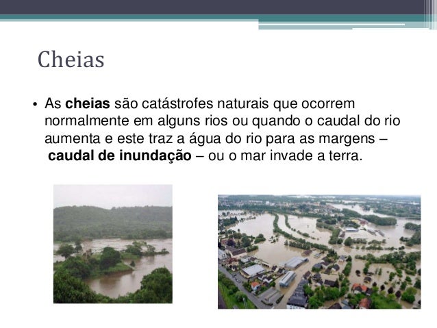 45. 45. Cheias• As cheias são catástrofes naturais que ocorremnormalmente em alguns rios ou quando o caudal do rioaumenta e este traz a água do rio para as margens –caudal de inundação – ou o mar invade a terra.