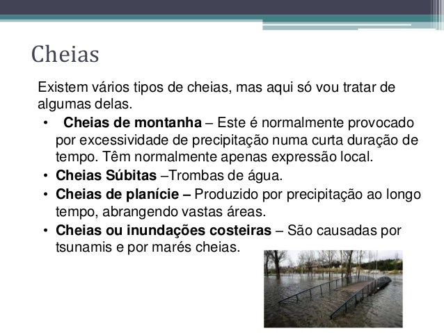 46. 46. CheiasExistem vários tipos de cheias, mas aqui só vou tratar dealgumas delas.• Cheias de montanha – Este é normalmente provocadopor excessividade de precipitação numa curta duração detempo. Têm normalmente apenas expressão local.• Cheias Súbitas –Trombas de água.• Cheias de planície – Produzido por precipitação ao longotempo, abrangendo vastas áreas.• Cheias ou inundações costeiras – São causadas portsunamis e por marés cheias.