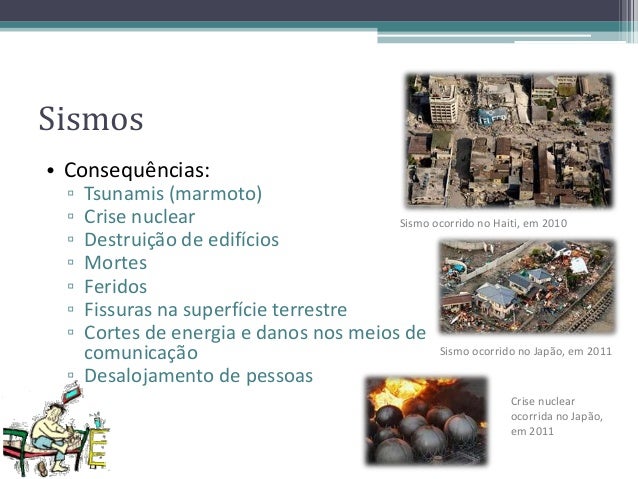 5. 5. Sismos• Consequências:▫ Tsunamis (marmoto)▫ Crise nuclear▫ Destruição de edifícios▫ Mortes▫ Feridos▫ Fissuras na superfície terrestre▫ Cortes de energia e danos nos meios decomunicação▫ Desalojamento de pessoasSismo ocorrido no Haiti, em 2010Sismo ocorrido no Japão, em 2011Crise nuclearocorrida no Japão,em 2011