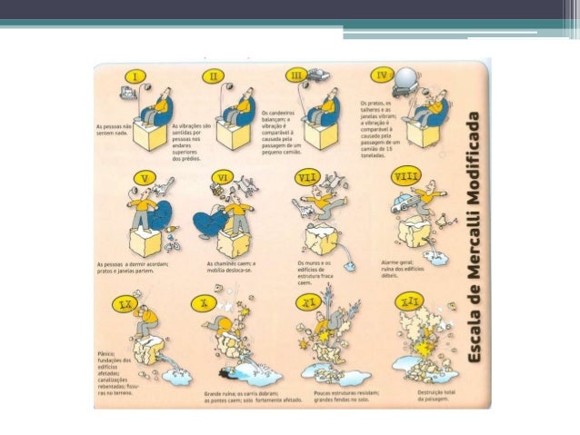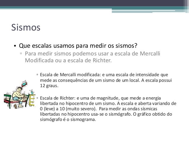 6. 6. Sismos• Que escalas usamos para medir os sismos?▫ Para medir sismos podemos usar a escala de MercalliModificada ou a escala de Richter.▫ Escala de Mercalli modificada: e uma escala de intensidade quemede as consequências de um sismo de um local. A escala possui12 graus.▫ Escala de Richter: e uma de magnitude, que mede a energialibertada no hipocentro de um sismo. A escala e aberta variando de0 (leve) a 10 (muito severo). Para medir as ondas sísmicaslibertadas no hipocentro usa-se o sismógrafo. O gráfico obtido dosismógrafo é o sismograma.