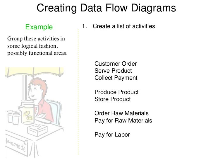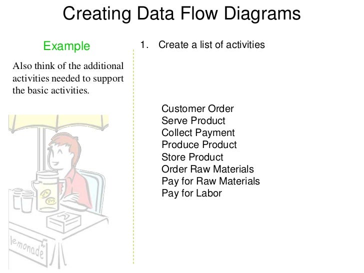7. 7. Creating Data Flow Diagrams Example 1. Create a list of activitiesThink through the activitiesthat take place at a lemonadestand. Customer Order Serve Product Collect Payment Produce Product Store Product