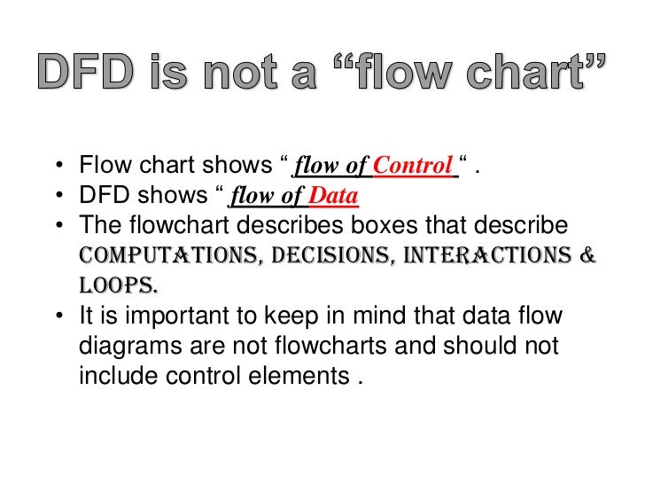 2. 2. • Flow chart shows “ flow of Control “ .• DFD shows “ flow of Data• The flowchart describes boxes that describe computations, decisions, interactions & loops.• It is important to keep in mind that data flow diagrams are not flowcharts and should not include control elements .