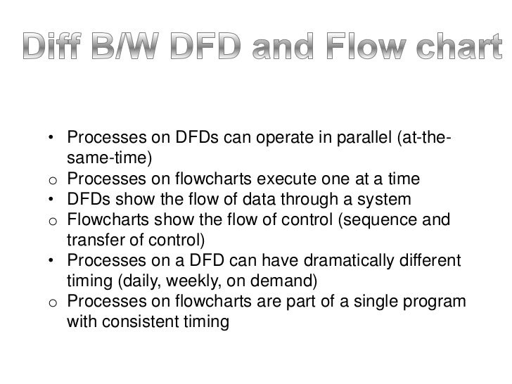 3. 3. • Processes on DFDs can operate in parallel (at-the- same-time)o Processes on flowcharts execute one at a time• DFDs show the flow of data through a systemo Flowcharts show the flow of control (sequence and transfer of control)• Processes on a DFD can have dramatically different timing (daily, weekly, on demand)o Processes on flowcharts are part of a single program with consistent timing