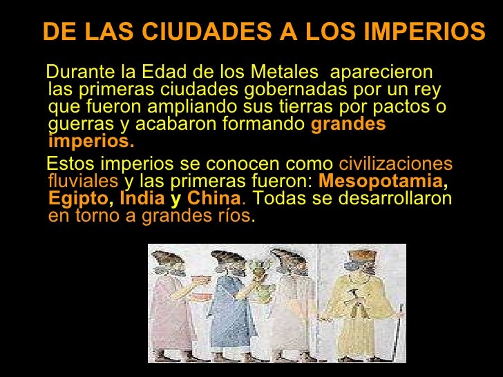 1. 2. DE LAS CIUDADES A LOS IMPERIOS <ul><li>Durante la Edad de los Metales aparecieron las primeras ciudades gobernadas por un rey que fueron ampliando sus tierras por pactos o guerras y acabaron formando grandes imperios. </li></ul><ul><li>Estos imperios se conocen como civilizaciones fluviales y las primeras fueron: Mesopotamia , Egipto , India y China . Todas se desarrollaron en torno a grandes ríos . </li></ul>
