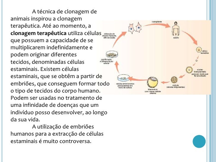 16. 16. A técnica de clonagem de animais inspirou a clonagem terapêutica. Até ao momento, a clonagemterapêutica utiliza células que possuem a capacidade de se multiplicarem indefinidamente e podem originar diferentes tecidos, denominadas células estaminais. Existem células estaminais, que se obtêm a partir de embriões, que conseguem formar todo o tipo de tecidos do corpo humano. Podem ser usadas no tratamento de uma infinidade de doenças que um indivíduo posso desenvolver, ao longo da sua vida.<br /> A utilização de embriões humanos para a extracção de células estaminais é muito controversa.<br />