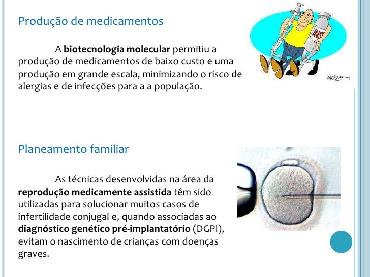 17. 17. Produção de medicamentos<br /> A biotecnologia molecular permitiu a produção de medicamentos de baixo custo e uma produção em grande escala, minimizando o risco de alergias e de infecções para a a população.<br />Planeamento familiar<br />As técnicas desenvolvidas na área da reprodução medicamente assistida têm sido utilizadas para solucionar muitos casos de infertilidade conjugal e, quando associadas ao diagnóstico genético pré-implantatório (DGPI), evitam o nascimento de crianças com doenças graves.<br />
