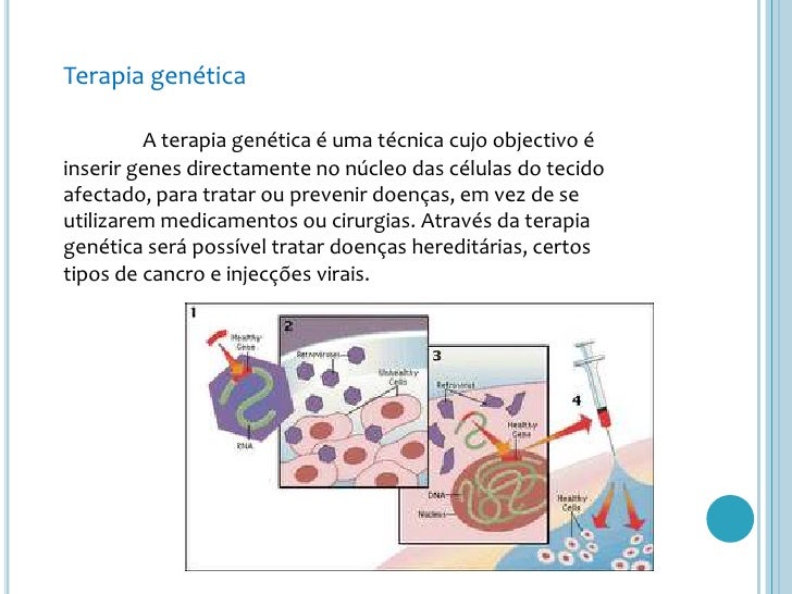 18. 18. Terapia genética<br />A terapia genética é uma técnica cujo objectivo é inserir genes directamente no núcleo das células do tecido afectado, para tratar ou prevenir doenças, em vez de se utilizarem medicamentos ou cirurgias. Através da terapia genética será possível tratar doenças hereditárias, certos tipos de cancro e injecções virais.<br />