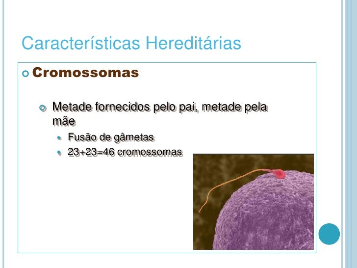3. 3. Cor dos olhos, estatura, tipo e cor do cabelo</li></li></ul><li>Características Hereditárias<br />Cromossomas<br /><ul><li>Metade fornecidos pelo pai, metade pela mãe