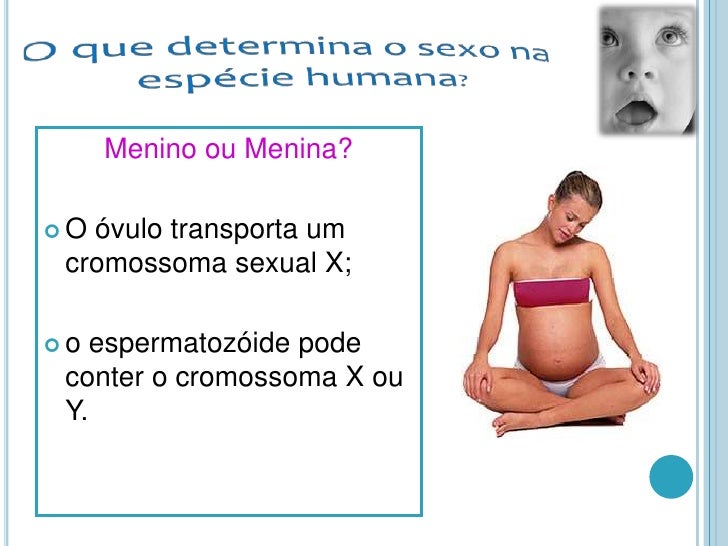 5. 5. 23+23=46 cromossomas</li></li></ul><li>O que determina o sexo na espécie humana?<br />Menino ou Menina?<br />O óvulo transporta um cromossoma sexual X;<br />o espermatozóide pode conter o cromossoma X ou Y.<br />
