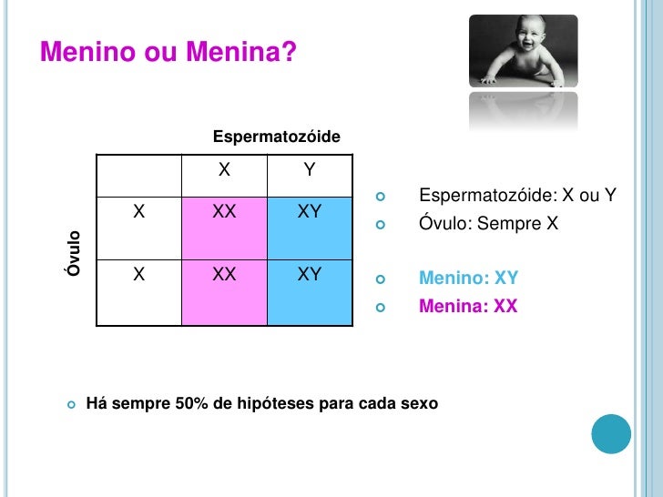 6. 6. Menino ou Menina?<br />Espermatozóide<br />Espermatozóide: X ou Y<br />Óvulo: Sempre X <br />Menino: XY<br />Menina: XX<br />Óvulo<br /><ul><li> Há sempre 50% de hipóteses para cada sexo</li></li></ul><li>Genes<br />Gene–Segmento de um cromossoma que contém informação sobre determinada característica<br />Genes Alelos–Genes situados no mesmo local de cada cromossoma do mesmo par e que determinam a mesma característica<br />