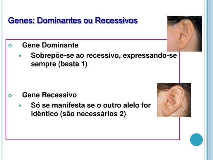 7. 7. Genes: Dominantes ou Recessivos<br />Gene Dominante<br />Sobrepõe-se ao recessivo, expressando-se sempre (basta 1)<br />Gene Recessivo<br />Só se manifesta se o outro alelo for idêntico (são necessários 2)<br />