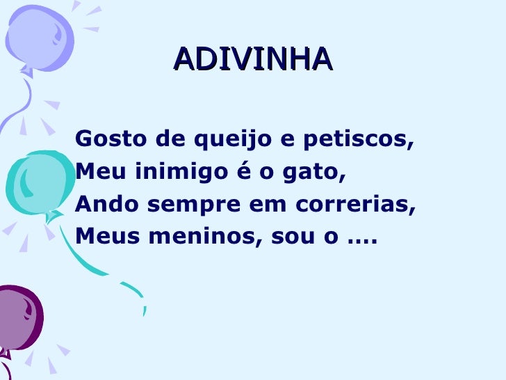 10. 10. ADIVINHA <ul><li>Gosto de queijo e petiscos, </li></ul><ul><li>Meu inimigo é o gato, </li></ul><ul><li>Ando sempre em correrias, </li></ul><ul><li>Meus meninos, sou o …. </li></ul>