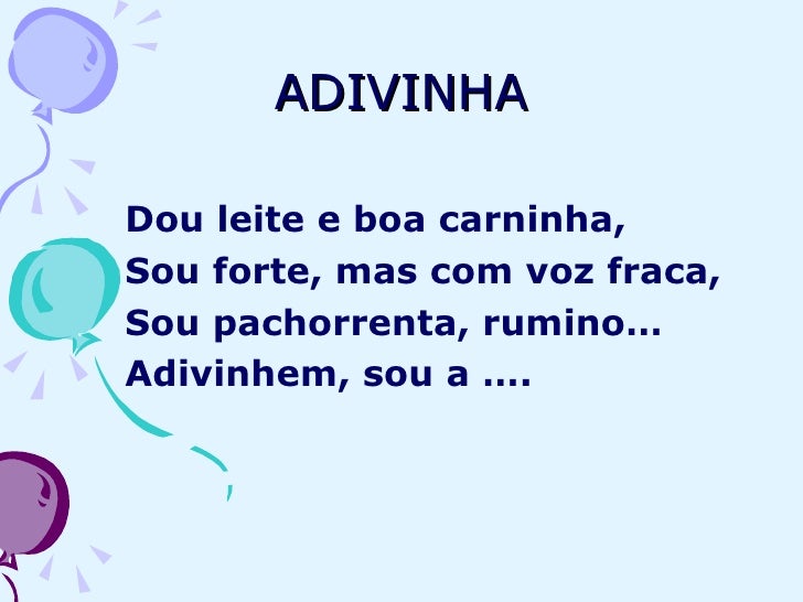 14. 14. ADIVINHA <ul><li>Dou leite e boa carninha, </li></ul><ul><li>Sou forte, mas com voz fraca, </li></ul><ul><li>Sou pachorrenta, rumino… </li></ul><ul><li>Adivinhem, sou a …. </li></ul>