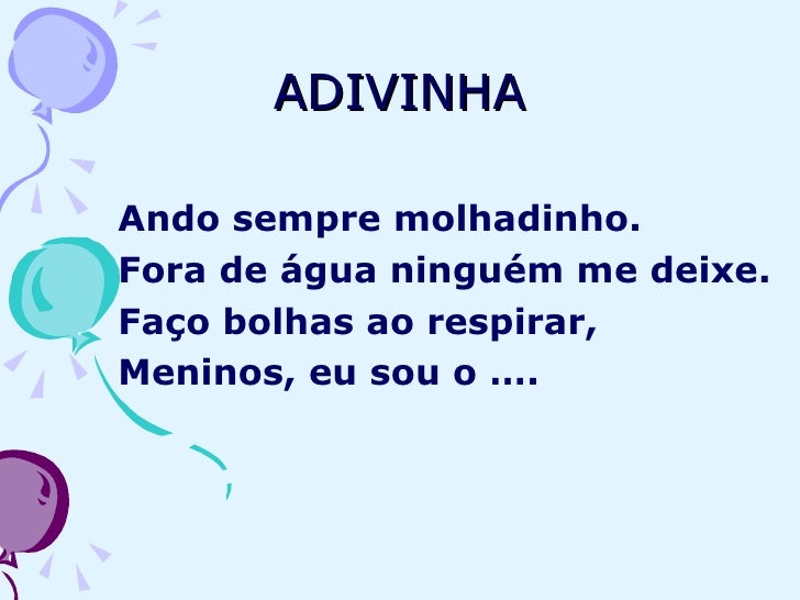 16. 16. ADIVINHA <ul><li>Ando sempre molhadinho. </li></ul><ul><li>Fora de água ninguém me deixe. </li></ul><ul><li>Faço bolhas ao respirar, </li></ul><ul><li>Meninos, eu sou o …. </li></ul>