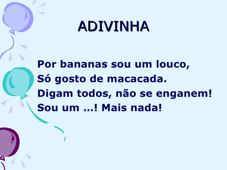 2. 2. ADIVINHA <ul><li>Por bananas sou um louco, </li></ul><ul><li>Só gosto de macacada. </li></ul><ul><li>Digam todos, não se enganem! </li></ul><ul><li>Sou um …! Mais nada! </li></ul>