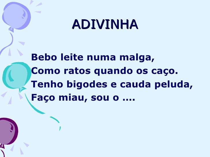 4. 4. ADIVINHA <ul><li>Bebo leite numa malga, </li></ul><ul><li>Como ratos quando os caço. </li></ul><ul><li>Tenho bigodes e cauda peluda, </li></ul><ul><li>Faço miau, sou o …. </li></ul>