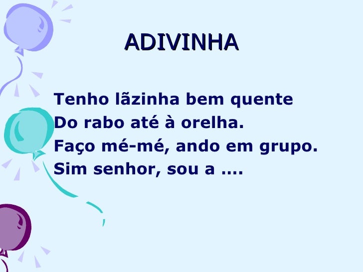 6. 6. ADIVINHA <ul><li>Tenho lãzinha bem quente </li></ul><ul><li>Do rabo até à orelha. </li></ul><ul><li>Faço mé-mé, ando em grupo. </li></ul><ul><li>Sim senhor, sou a …. </li></ul>