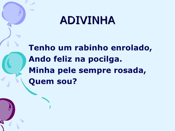 8. 8. ADIVINHA <ul><li>Tenho um rabinho enrolado, </li></ul><ul><li>Ando feliz na pocilga. </li></ul><ul><li>Minha pele sempre rosada, </li></ul><ul><li>Quem sou? </li></ul>
