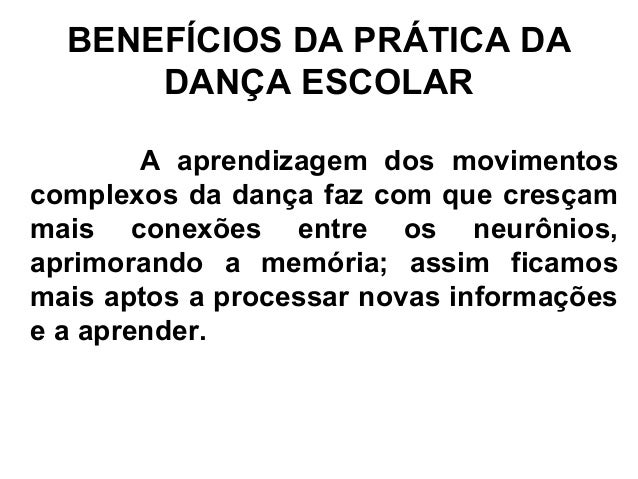 11. 11. BENEFÍCIOS DA PRÁTICA DA DANÇA ESCOLAR A aprendizagem dos movimentos complexos da dança faz com que cresçam mais conexões entre os neurônios, aprimorando a memória; assim ficamos mais aptos a processar novas informações e a aprender.