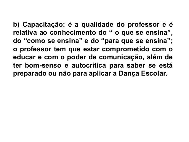 5. 5. b) Capacitação: é a qualidade do professor e é relativa ao conhecimento do “ o que se ensina”, do “como se ensina” e do “para que se ensina”; o professor tem que estar comprometido com o educar e com o poder de comunicação, além de ter bom-senso e autocrítica para saber se está preparado ou não para aplicar a Dança Escolar.