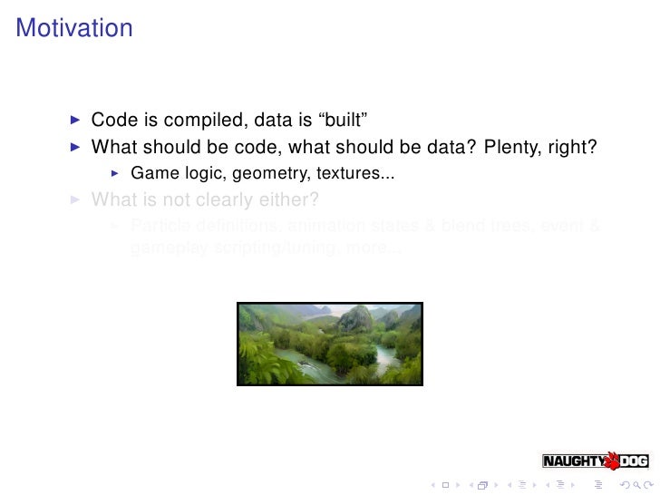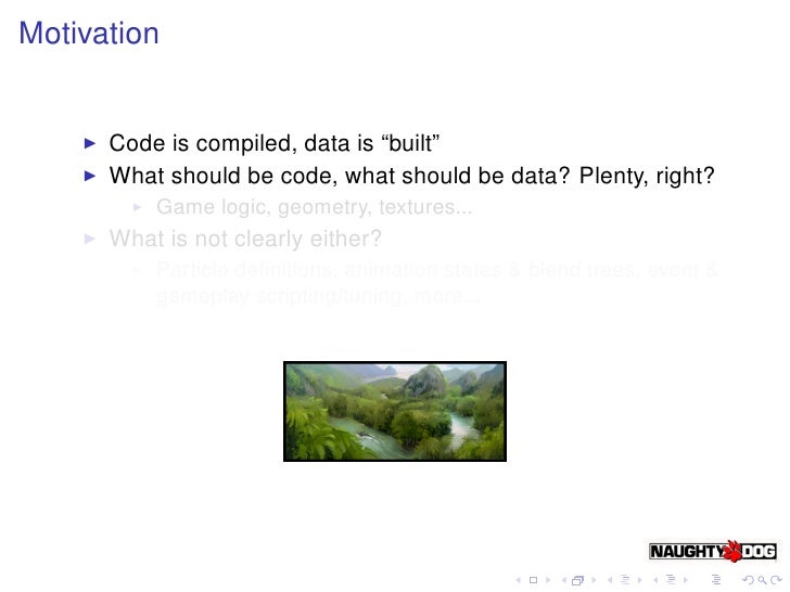 2. 2. Motivation Code is compiled, data is “built” What should be code, what should be data? Plenty, right? Game logic, geometry, textures... What is not clearly either? Particle definitions, animation states & blend trees, event & gameplay scripting/tuning, more...
