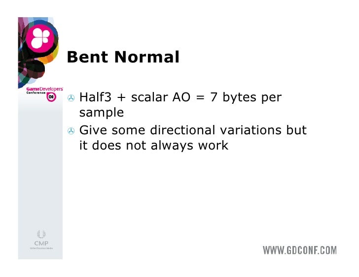 9. 9. Bent Normal   Half3 + scalar AO = 7 bytes per sample   Give some directional variations but it does not always work