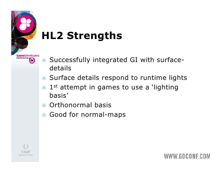 14. 14. HL2 Strengths   Successfully integrated GI with surface- details   Surface details respond to runtime lights   1st attempt in games to use a ‘lighting basis’   Orthonormal basis   Good for normal-maps