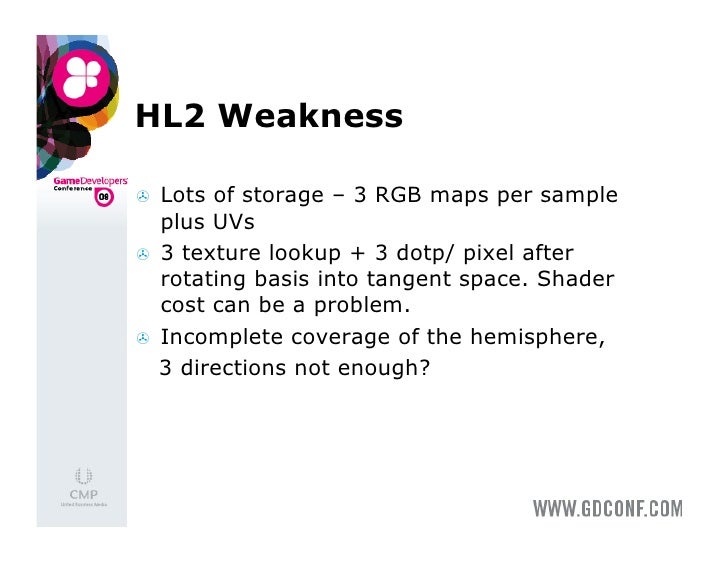 15. 15. HL2 Weakness   Lots of storage – 3 RGB maps per sample plus UVs   3 texture lookup + 3 dotp/ pixel after rotating basis into tangent space. Shader cost can be a problem.   Incomplete coverage of the hemisphere, 3 directions not enough?