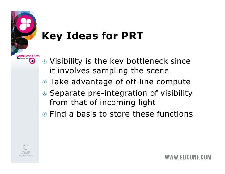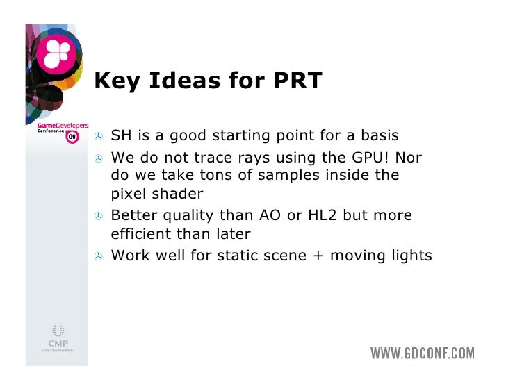17. 17. Key Ideas for PRT   SH is a good starting point for a basis   We do not trace rays using the GPU! Nor do we take tons of samples inside the pixel shader   Better quality than AO or HL2 but more efficient than later   Work well for static scene + moving lights