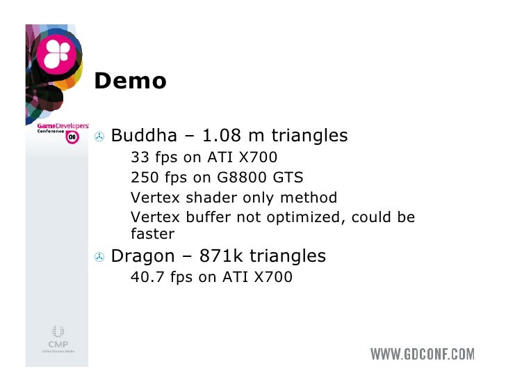 19. 19. Demo   Buddha – 1.08 m triangles   33 fps on ATI X700   250 fps on G8800 GTS   Vertex shader only method   Vertex buffer not optimized, could be faster   Dragon – 871k triangles   40.7 fps on ATI X700