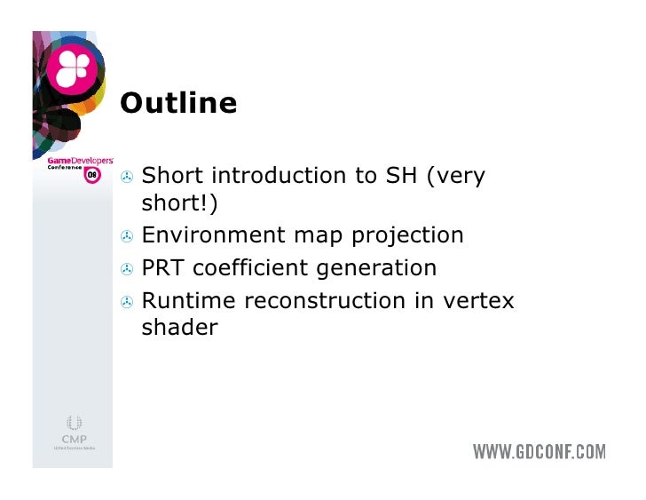 21. 21. Outline   Short introduction to SH (very short!)   Environment map projection   PRT coefficient generation   Runtime reconstruction in vertex shader