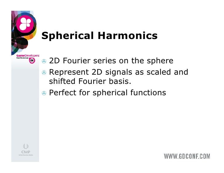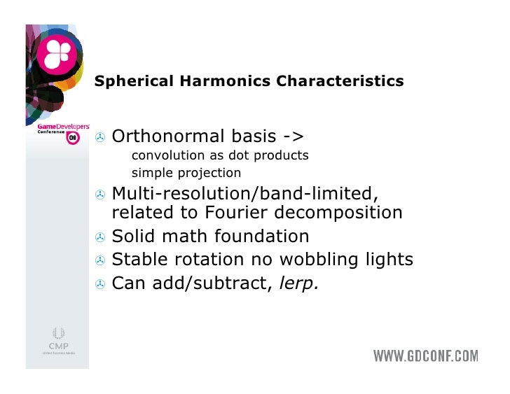 24. 24. Spherical Harmonics Characteristics   Orthonormal basis ->   convolution as dot products   simple projection   Multi-resolution/band-limited, related to Fourier decomposition   Solid math foundation   Stable rotation no wobbling lights   Can add/subtract, lerp.
