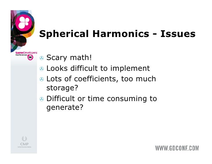 27. 27. Spherical Harmonics - Issues   Scary math!   Looks difficult to implement   Lots of coefficients, too much storage?   Difficult or time consuming to generate?