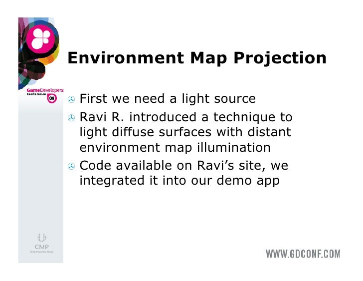 28. 28. Environment Map Projection   First we need a light source   Ravi R. introduced a technique to light diffuse surfaces with distant environment map illumination   Code available on Ravi’s site, we integrated it into our demo app
