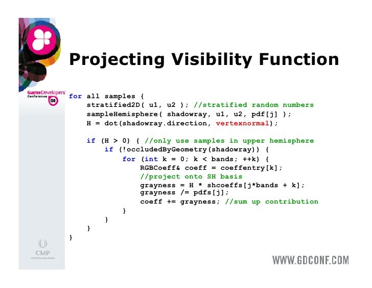 34. 34. Projecting Visibility Function for all samples { stratified2D( u1, u2 ); //stratified random numbers sampleHemisphere( shadowray, u1, u2, pdf[j] ); H = dot(shadowray.direction, vertexnormal); if (H > 0) { //only use samples in upper hemisphere if (!occludedByGeometry(shadowray)) { for (int k = 0; k < bands; ++k) { RGBCoeff& coeff = coeffentry[k]; //project onto SH basis grayness = H * shcoeffs[j*bands + k]; grayness /= pdfs[j]; coeff += grayness; //sum up contribution } } } }
