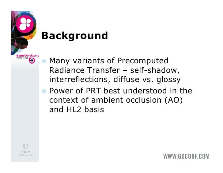 3. 3. Background   Many variants of Precomputed Radiance Transfer – self-shadow, interreflections, diffuse vs. glossy   Power of PRT best understood in the context of ambient occlusion (AO) and HL2 basis